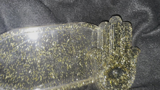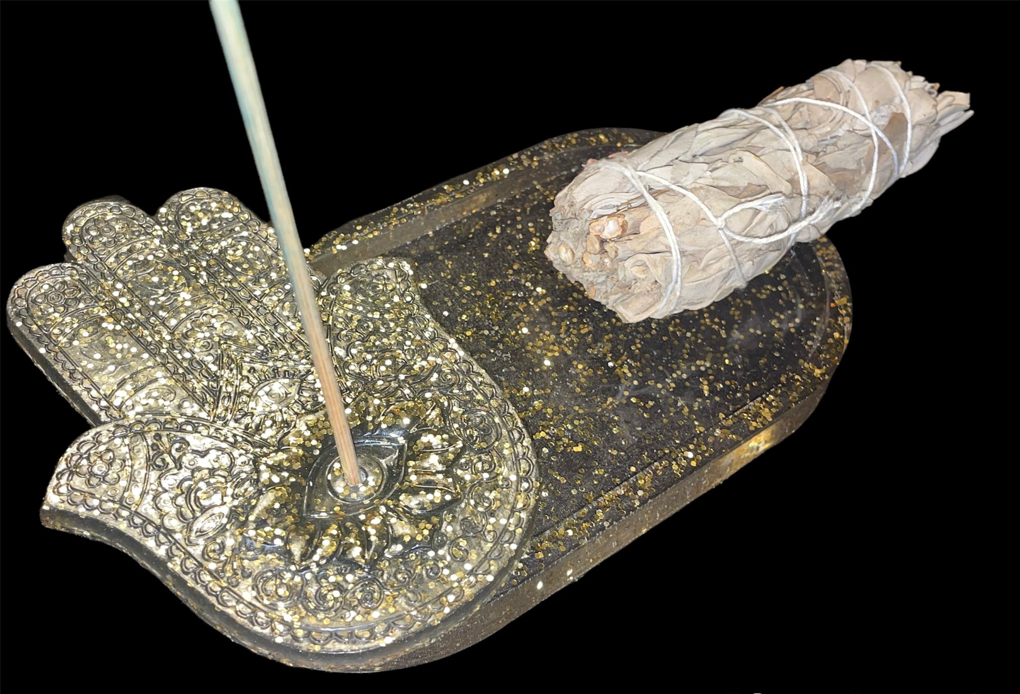 Tinted black with gold glitter ✨ Hamsa 🪬 incense holder with matching trinket/candle tray.